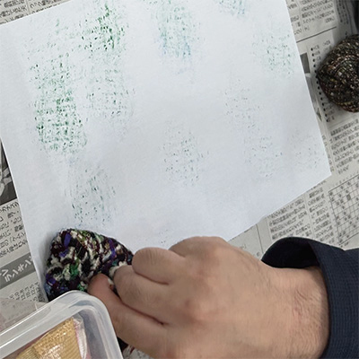 インクの動きと布の模様が織りなす、小さな盆栽の世界。