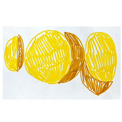 アーティストさんにじゃがいもときゅうりを描いてもらった絵の線の動きの楽しさを残しながらデザインした(Sana)