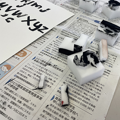 今回はスポンジを使って文字を作ってみました。スポンジを文字のパーツにカットして、絵の具をつけて紙に押すことで、迫力のある表現になったと思います。このフォントは、インパクトのあるタイトルに使えるようにデザインしました。ポスターなどに活用できると思います。(HOULU)
