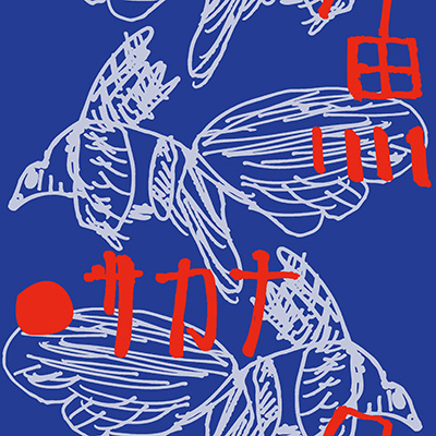 青い海に白い線で魚を描き、赤い文字を浮かべました。海の静けさと生命の躍動を、墨絵のような線描で表現しています。(LOU)