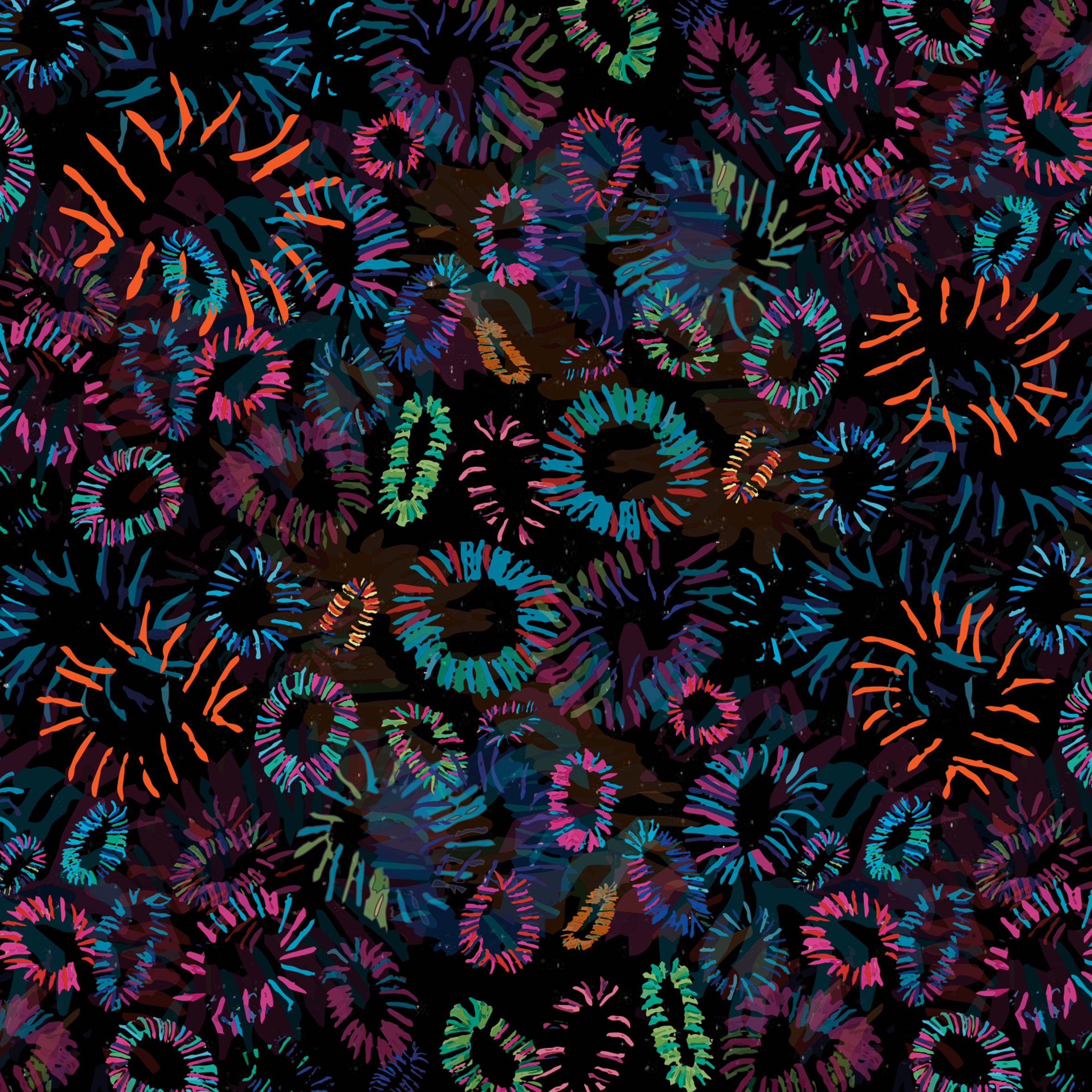 もともとは輪状の布を糸で縫い付けた刺繍作品でした。細かいながらも大胆な印象の作品を、花火というデザインに昇華していただき、作者らしさにもつながっているように感じられます。(くるるえびす)